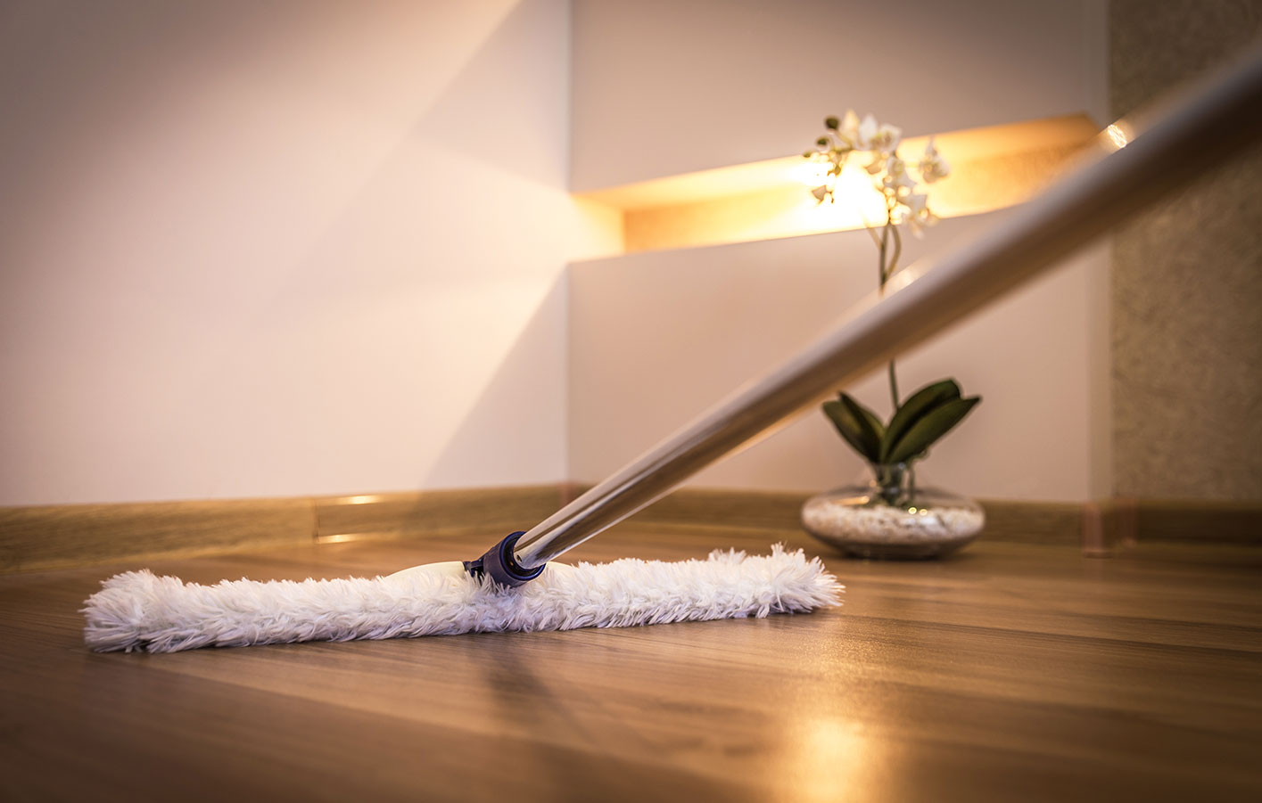 Zum Abschluss empfiehlt sich die Oberfläche des fertig verlegten Parketts mit einem Bodenpflegemittel zu reinigen. Diesen Vorgang nennt man Ersteinpflege.